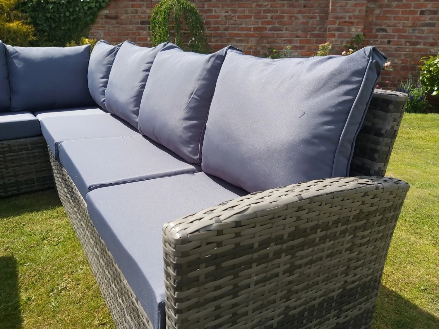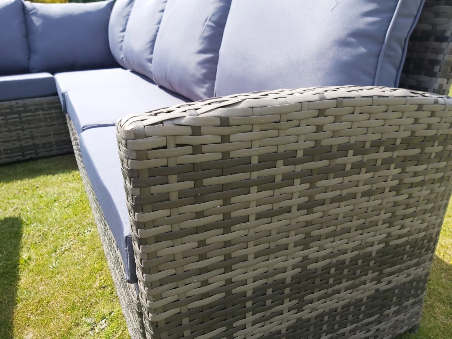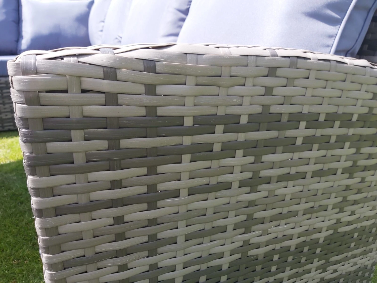 The grey rattan frame comes with grey coloured cushions.