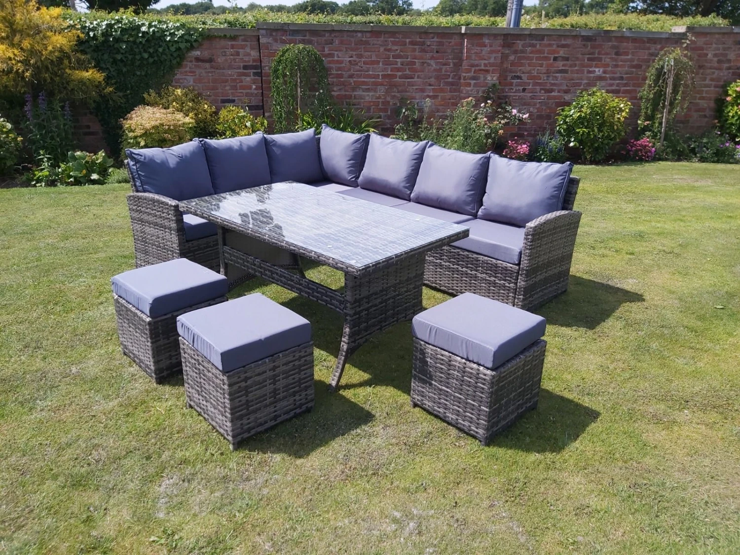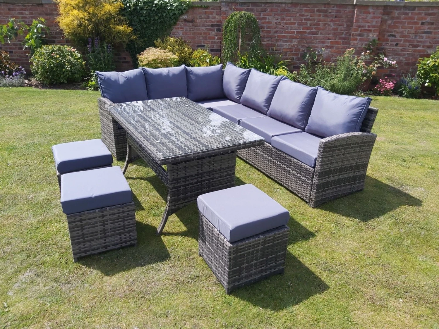 Please be advised, although the set is advertised as weather proof, the cushions themselves are only shower proof. Artificial Rattan 9 Seater Garden Set / 3 Matching Stools / Weatherproof Frame