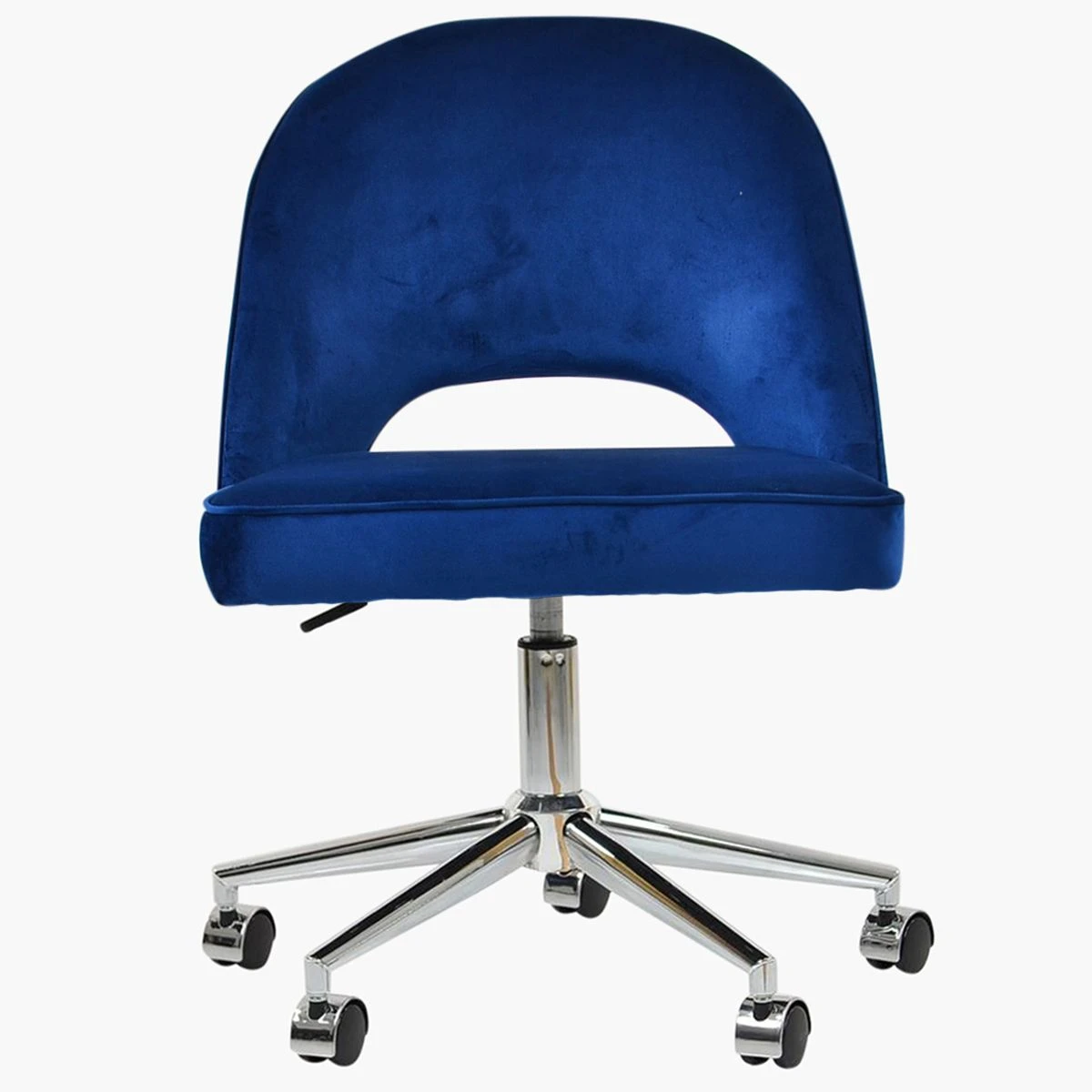 Introduce a touch of elegance to your workspace with the Flair office chair in stylish blue velvet. Its thickly padded backrest and seat promise hours of comfort. The gas lift height adjustment and 360-degree swivel offer flexibility and movement. The chair has smooth castors and a unique cut-out detail in the backrest for added style. The chrome base unit enhances its modern appeal. This chair is ready for next-day delivery and currently in stock.