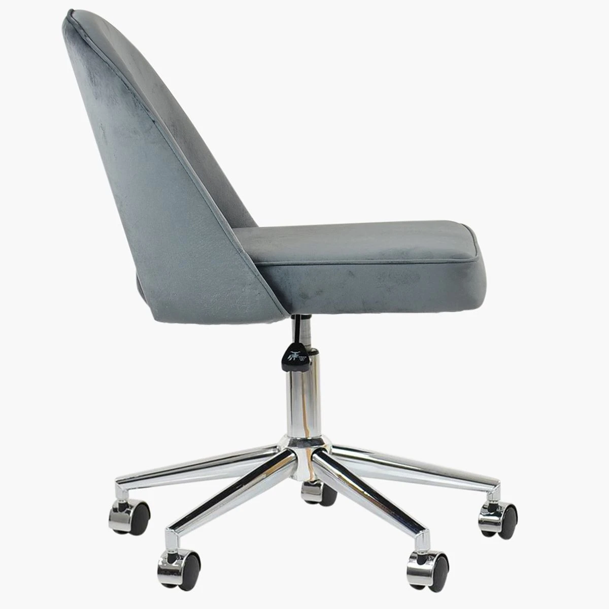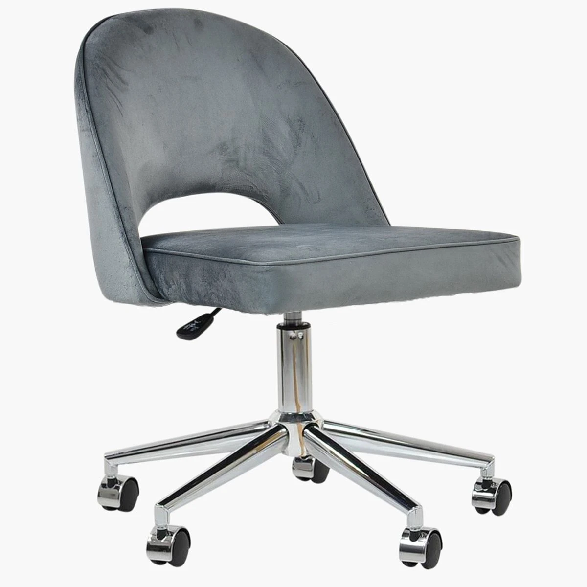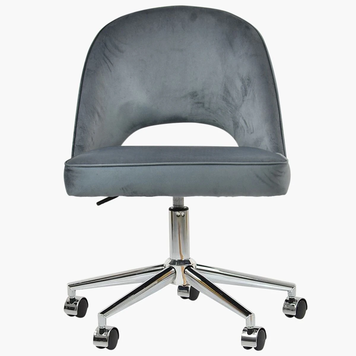 Meet the Flair office chair in sophisticated dark grey velvet. The thickly padded backrest and seat provide ultimate comfort. Enjoy the convenience of the gas lift height adjustment and 360-degree swivel. The chair features smooth castors and a unique cut-out detail in the backrest. Its chrome base unit adds a modern flair. This chair is in stock and ready for next-day delivery.