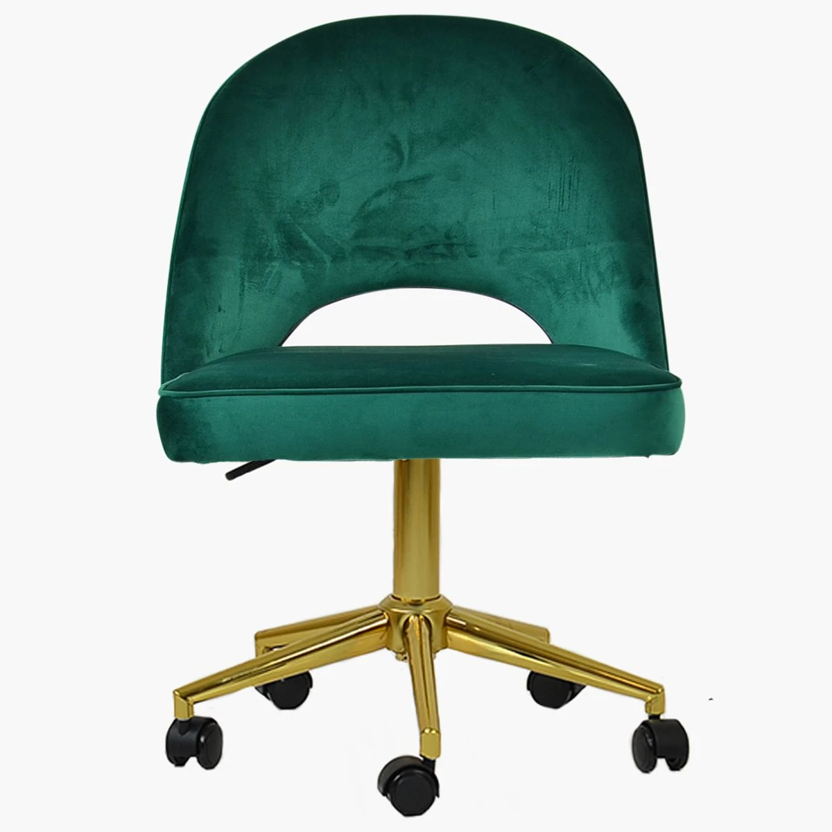 Check out the Flair office chair in trendy green velvet. Its thickly padded backrest and seat guarantee maximum comfort. You’ll enjoy flexible seating with the gas lift height adjustment and 360-degree swivel. It features smooth castors and a unique cut-out detail in the backrest. The shiny gold base unit gives a luxurious touch. This chair is currently in stock and ready for next-day delivery.