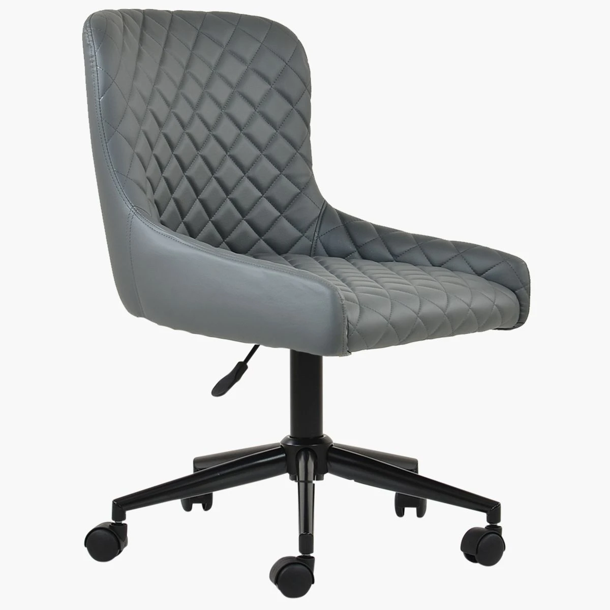 Introducing the Heron office chair in sleek dark grey faux leather. The high backrest curves gently for maximum comfort. Customize your seating with gas lift height adjustment and 360-degree swivel. Easy-to-move castors add convenience, while the diamond detail stitching offers a refined look. The black base unit brings a contemporary touch. This chair is available for next-day delivery and is currently in stock.