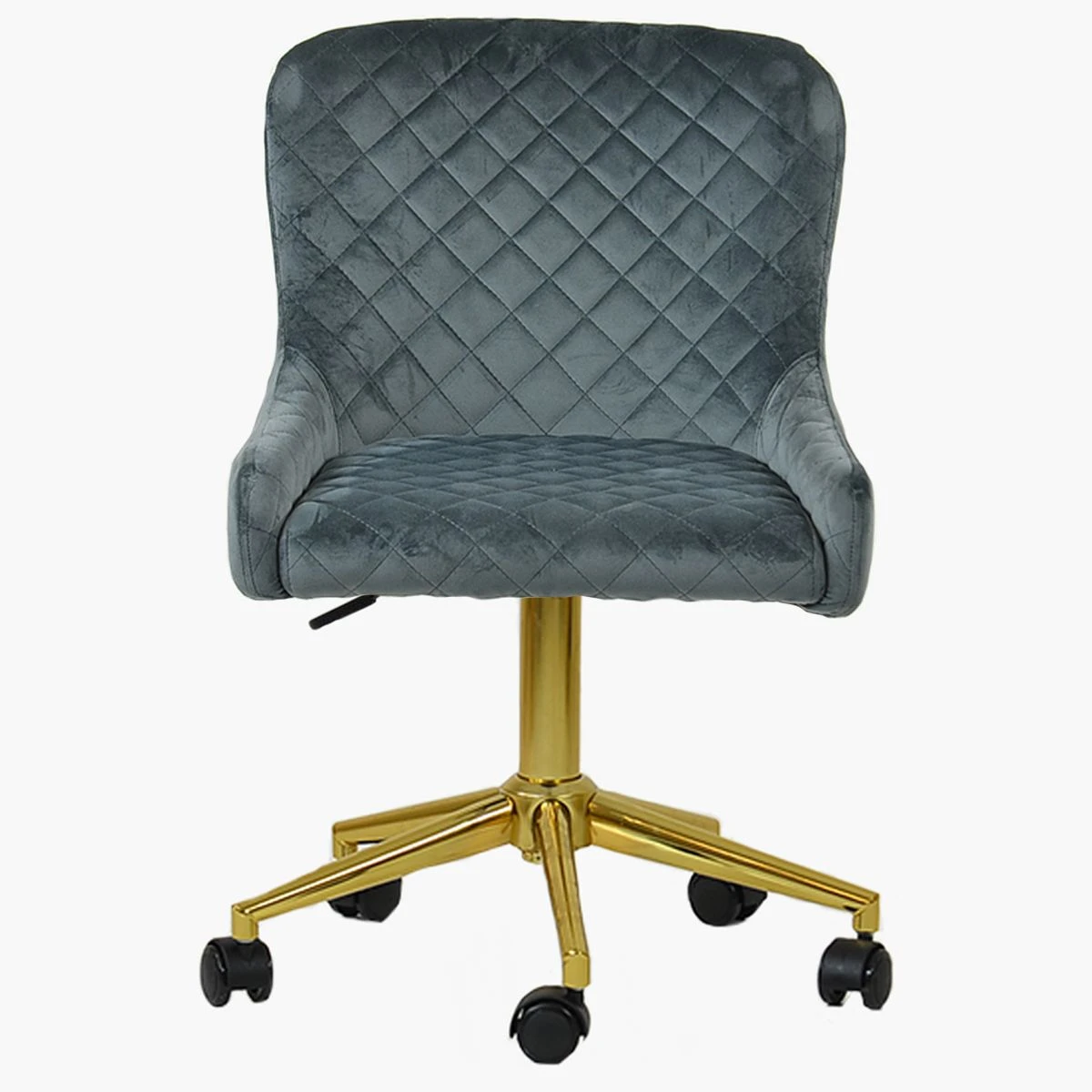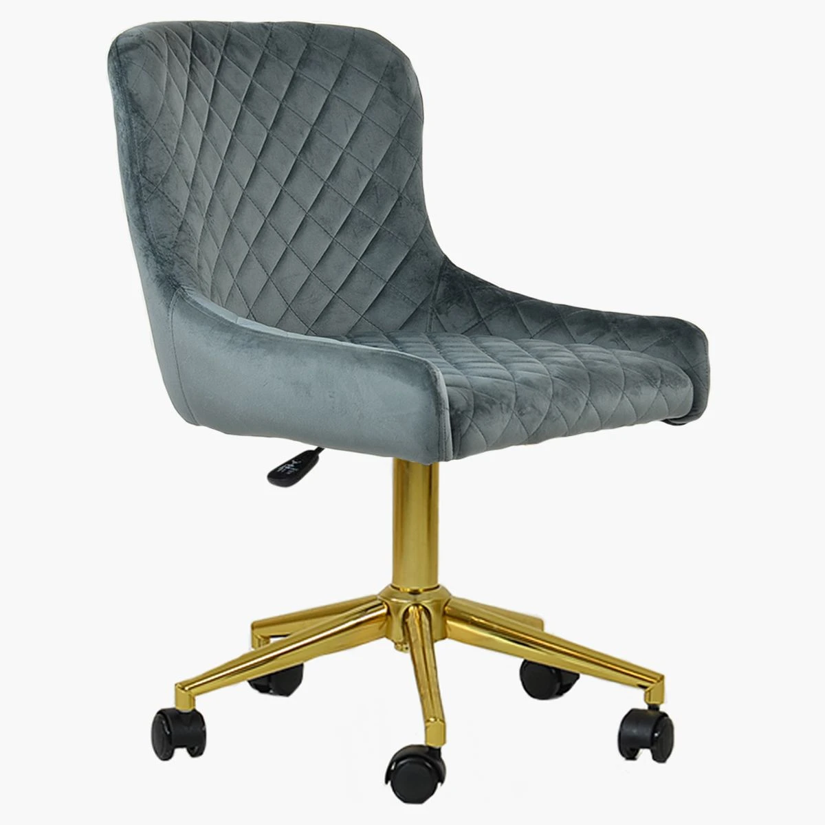 Sink into comfort with our Heron chair in dark grey velvet. The high backrest with curved sides supports you perfectly. Adjust your seating with the gas lift and swivel features. Moving the chair is easy with the castors. The diamond detail stitching gives a fancy vibe, and the gold electroplated base adds a fancy touch. This chair is in stock and available for next-day delivery.