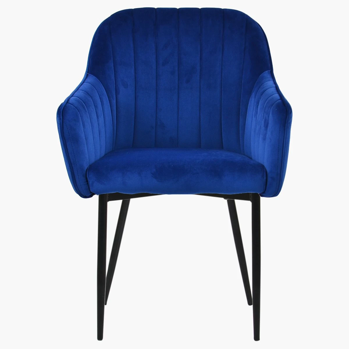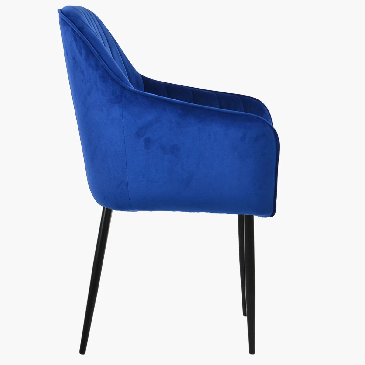 Introducing our Lule dining chair in blue velvet, a lively addition to your dining space. The large seat invites you to sit and stay awhile. Comfortable armrests add to the chair’s cosy feel. The horizontal panel stitching on the velvet creates an appealing pattern. Its black-coated solid metal legs contrast beautifully with the orange. We have matching Hamilton bar stools, perfect for a cohesive look. Best part? This chair can be delivered the very next day!