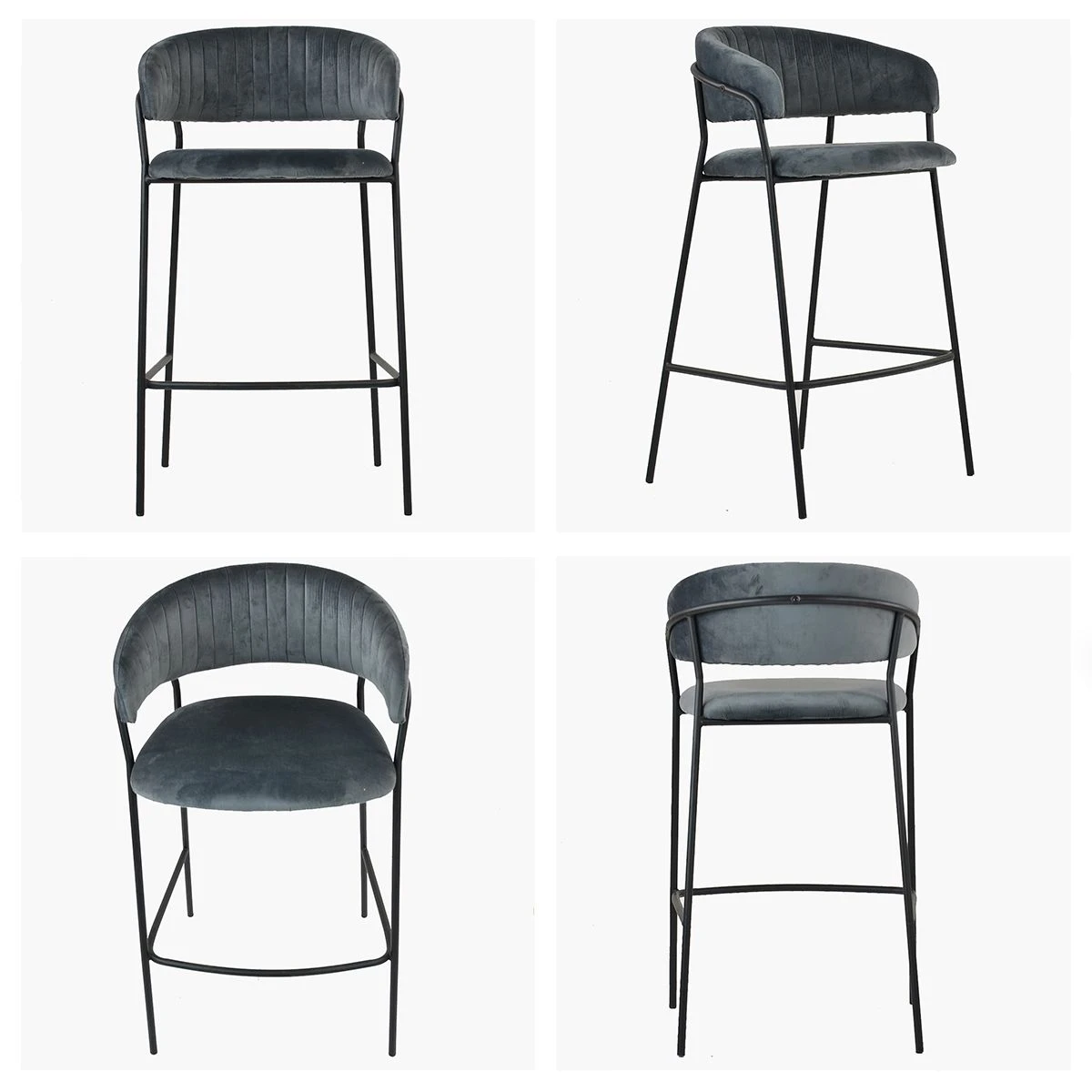 Add a touch of elegance to your kitchen with the Mando bar stool in dark grey velvet. Enjoy unmatched comfort with its supportive backrest, fixed height with footrest, and armrests. The modern style design with vertical stitching enhances its chic appearance. With its robust construction, this bar stool guarantees durability and long-lasting use. The black base complements the dark grey velvet seat perfectly. Plus, it’s in stock and ready for delivery, so you can effortlessly upgrade your kitchen and indulge in the comfort of this stylish seating option.