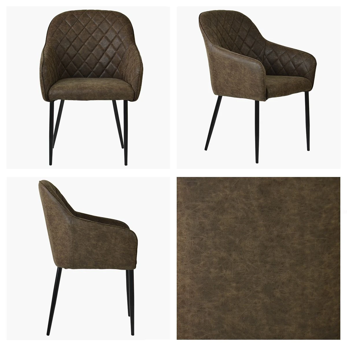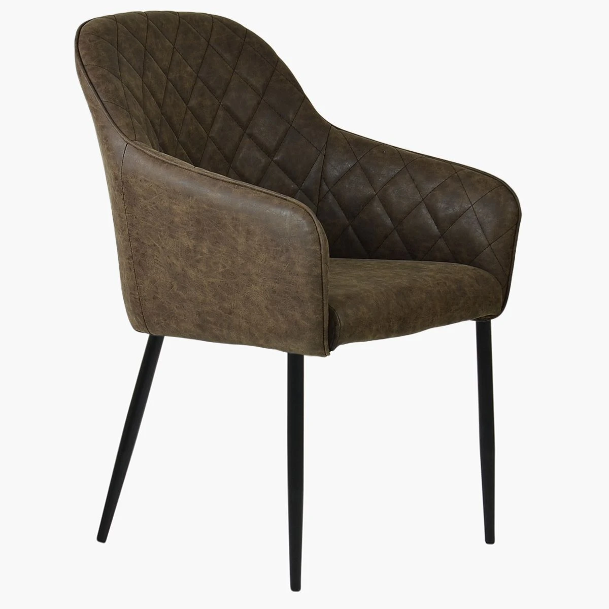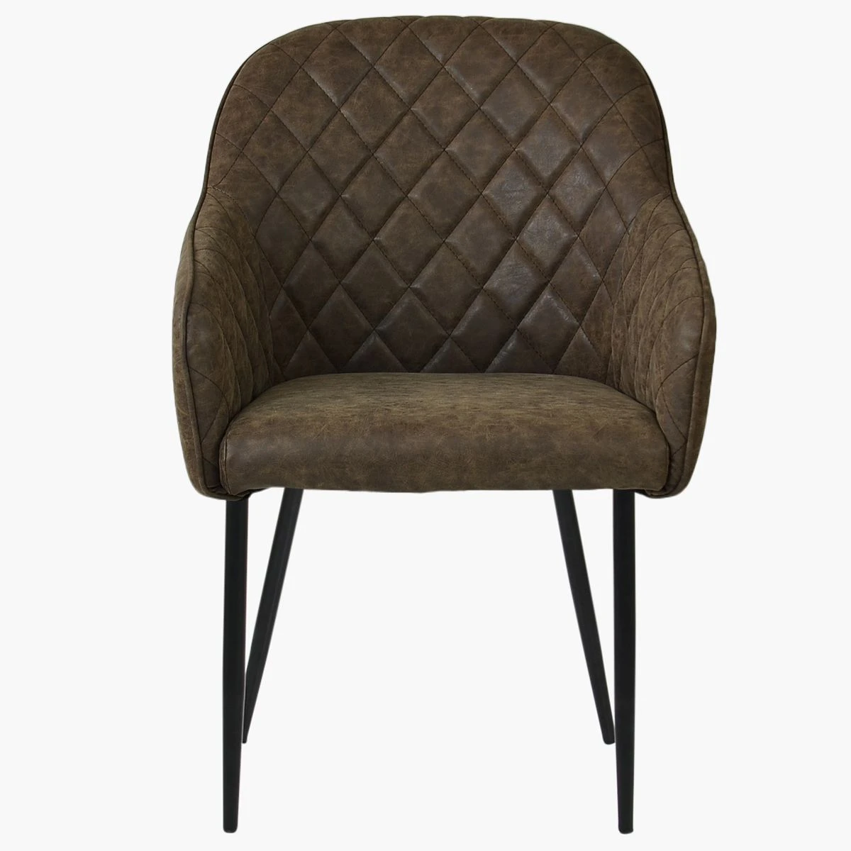 Experience timeless comfort with the Opus Carver chair in antique brown. The large seat is inviting, perfect for a hearty meal. Ample armrests add to its cosy feel, while the high backrest provides superior support. The decorative diamond stitching across the backrest and under the arms is a classic touch. Its black-painted solid metal legs offer stability and contrast. Best of all, it’s available for next-day delivery.