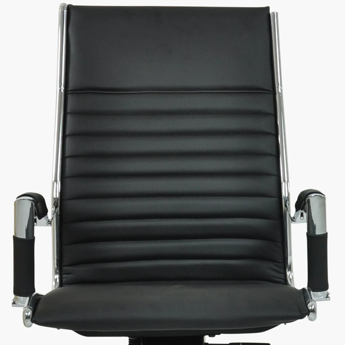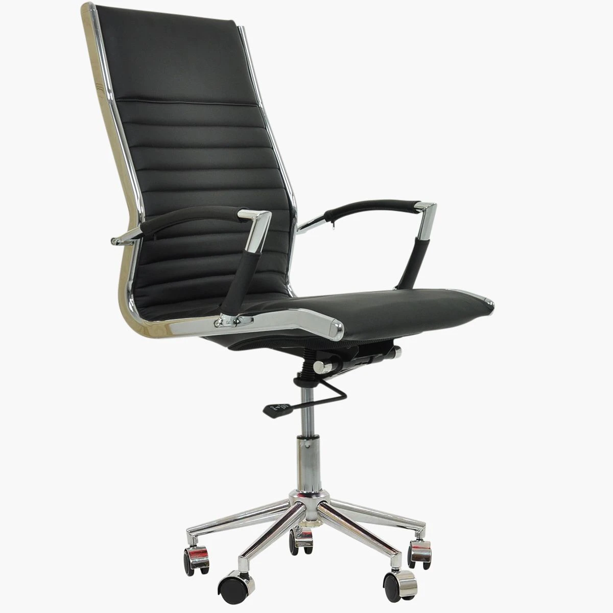 This black faux leather Spark office chair combines comfort and sleek design. The wide seat and high backrest with padding ensure a relaxing sitting experience. Chrome armrests give an elegant touch to the overall look. With the 360-degree swivel and adjustable height, you can adjust it to your perfect fit. The chrome base, combined with smooth castors, allows for easy movement. This chair is in stock and available for next-day delivery.